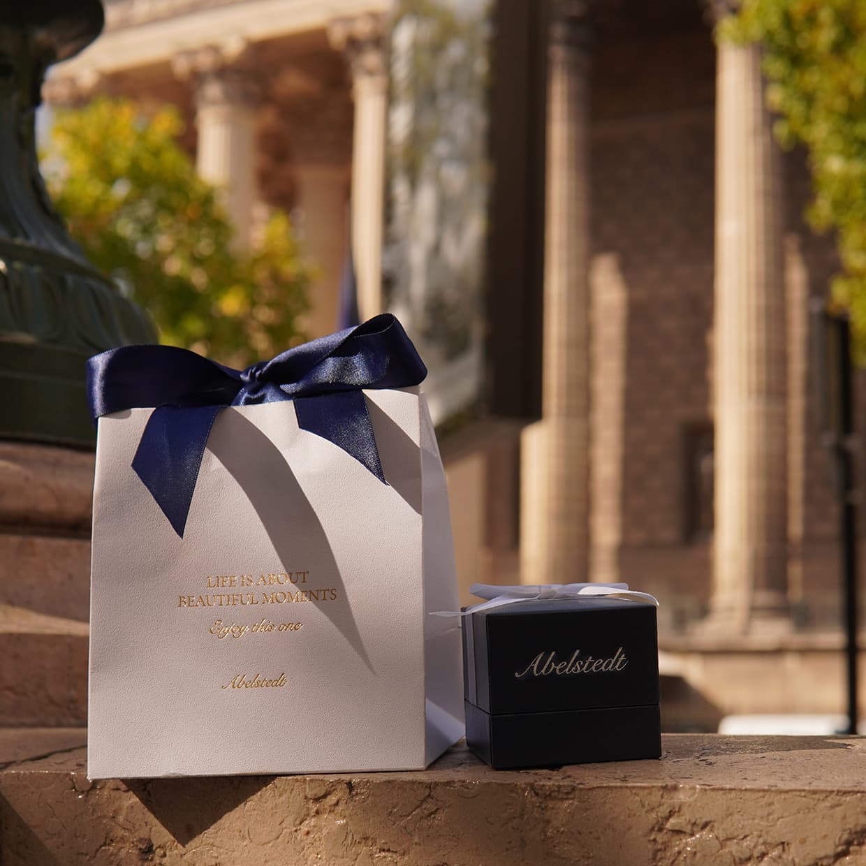 Varje Abelstedt smycke kommer inlindat i en Abelstedt-blå låda förseglad med ett vitt satinband.